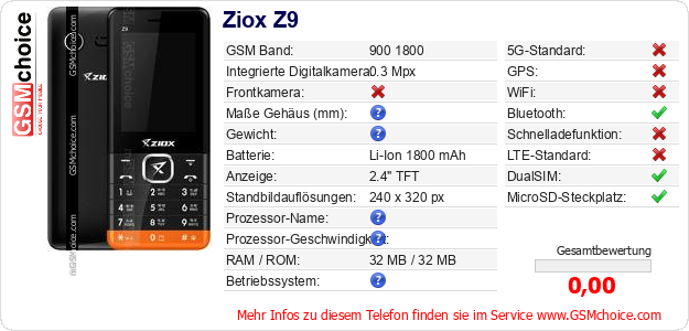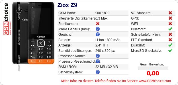 Hast du eigene Webseite? Willst du die Informationen über Standarddaten des Handys Ziox Z9 irgendwo veröffentlichen? Das ist sehr einfach. Du kannst das Bild herunterladen oder kopieren und auf der Webseite folgenden Code hinzufügen:Das Einfügen von diesem Code verursacht das Anzeigen von dem folgenden Bild: