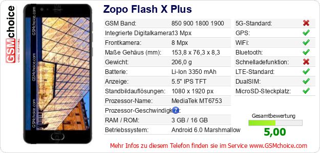 Hast du eigene Webseite? Willst du die Informationen über Standarddaten des Handys Zopo Flash X Plus irgendwo veröffentlichen? Das ist sehr einfach. Du kannst das Bild herunterladen oder kopieren und auf der Webseite folgenden Code hinzufügen:Das Einfügen von diesem Code verursacht das Anzeigen von dem folgenden Bild: