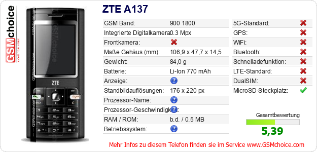 Hast du eigene Webseite? Willst du die Informationen über Standarddaten des Handys ZTE A137 irgendwo veröffentlichen? Das ist sehr einfach. Du kannst das Bild herunterladen oder kopieren und auf der Webseite folgenden Code hinzufügen:Das Einfügen von diesem Code verursacht das Anzeigen von dem folgenden Bild: