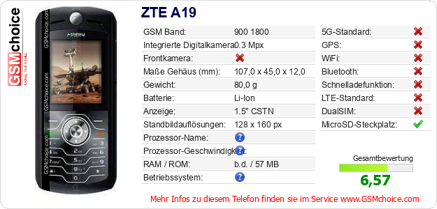 Hast du eigene Webseite? Willst du die Informationen über Standarddaten des Handys ZTE A19 irgendwo veröffentlichen? Das ist sehr einfach. Du kannst das Bild herunterladen oder kopieren und auf der Webseite folgenden Code hinzufügen:Das Einfügen von diesem Code verursacht das Anzeigen von dem folgenden Bild: