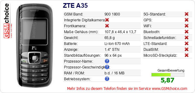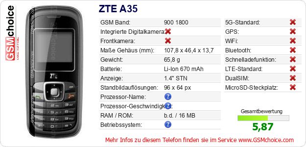 Hast du eigene Webseite? Willst du die Informationen über Standarddaten des Handys ZTE A35 irgendwo veröffentlichen? Das ist sehr einfach. Du kannst das Bild herunterladen oder kopieren und auf der Webseite folgenden Code hinzufügen:Das Einfügen von diesem Code verursacht das Anzeigen von dem folgenden Bild: