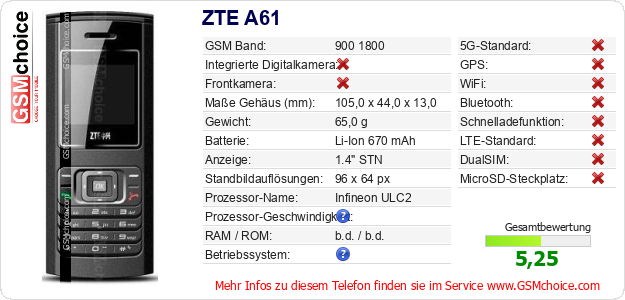 Hast du eigene Webseite? Willst du die Informationen über Standarddaten des Handys ZTE A61 irgendwo veröffentlichen? Das ist sehr einfach. Du kannst das Bild herunterladen oder kopieren und auf der Webseite folgenden Code hinzufügen:Das Einfügen von diesem Code verursacht das Anzeigen von dem folgenden Bild: