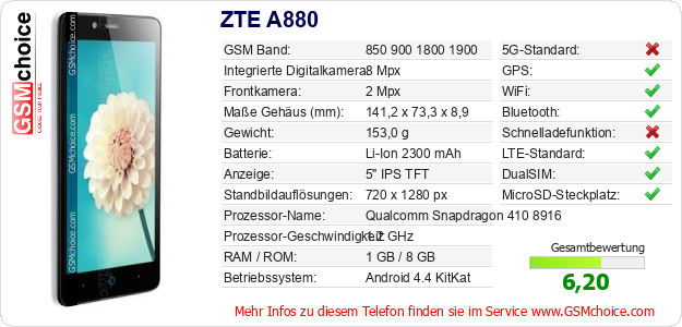 Hast du eigene Webseite? Willst du die Informationen über Standarddaten des Handys ZTE A880 irgendwo veröffentlichen? Das ist sehr einfach. Du kannst das Bild herunterladen oder kopieren und auf der Webseite folgenden Code hinzufügen:Das Einfügen von diesem Code verursacht das Anzeigen von dem folgenden Bild: