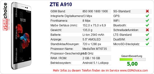 Hast du eigene Webseite? Willst du die Informationen über Standarddaten des Handys ZTE A910 irgendwo veröffentlichen? Das ist sehr einfach. Du kannst das Bild herunterladen oder kopieren und auf der Webseite folgenden Code hinzufügen:Das Einfügen von diesem Code verursacht das Anzeigen von dem folgenden Bild: