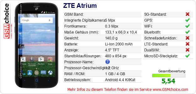 Hast du eigene Webseite? Willst du die Informationen über Standarddaten des Handys ZTE Atrium irgendwo veröffentlichen? Das ist sehr einfach. Du kannst das Bild herunterladen oder kopieren und auf der Webseite folgenden Code hinzufügen:Das Einfügen von diesem Code verursacht das Anzeigen von dem folgenden Bild: