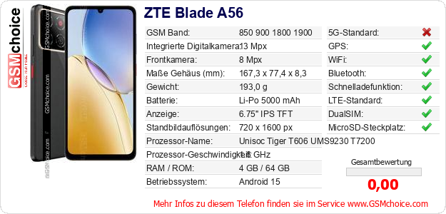Hast du eigene Webseite? Willst du die Informationen über Standarddaten des Handys ZTE Blade A56 irgendwo veröffentlichen? Das ist sehr einfach. Du kannst das Bild herunterladen oder kopieren und auf der Webseite folgenden Code hinzufügen:Das Einfügen von diesem Code verursacht das Anzeigen von dem folgenden Bild: