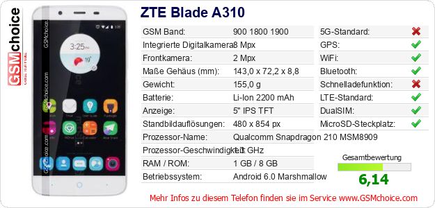 Hast du eigene Webseite? Willst du die Informationen über Standarddaten des Handys ZTE Blade A310 irgendwo veröffentlichen? Das ist sehr einfach. Du kannst das Bild herunterladen oder kopieren und auf der Webseite folgenden Code hinzufügen:Das Einfügen von diesem Code verursacht das Anzeigen von dem folgenden Bild: