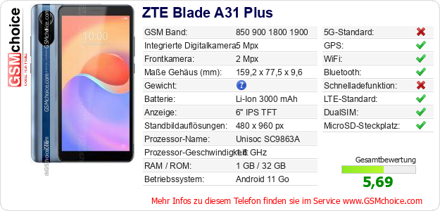 Hast du eigene Webseite? Willst du die Informationen über Standarddaten des Handys ZTE Blade A31 Plus irgendwo veröffentlichen? Das ist sehr einfach. Du kannst das Bild herunterladen oder kopieren und auf der Webseite folgenden Code hinzufügen:Das Einfügen von diesem Code verursacht das Anzeigen von dem folgenden Bild: