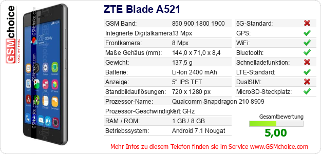 Hast du eigene Webseite? Willst du die Informationen über Standarddaten des Handys ZTE Blade A521 irgendwo veröffentlichen? Das ist sehr einfach. Du kannst das Bild herunterladen oder kopieren und auf der Webseite folgenden Code hinzufügen:Das Einfügen von diesem Code verursacht das Anzeigen von dem folgenden Bild: