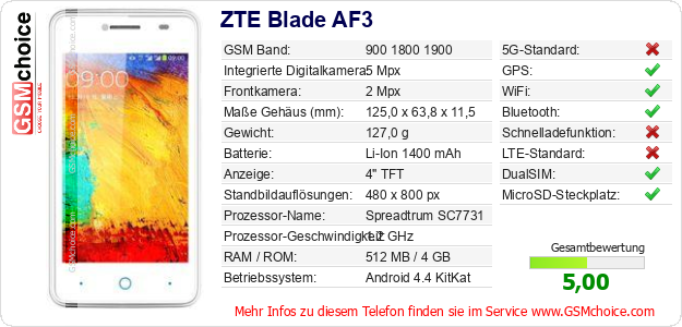 Hast du eigene Webseite? Willst du die Informationen über Standarddaten des Handys ZTE Blade AF3 irgendwo veröffentlichen? Das ist sehr einfach. Du kannst das Bild herunterladen oder kopieren und auf der Webseite folgenden Code hinzufügen:Das Einfügen von diesem Code verursacht das Anzeigen von dem folgenden Bild: