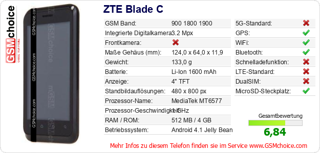 Hast du eigene Webseite? Willst du die Informationen über Standarddaten des Handys ZTE Blade C irgendwo veröffentlichen? Das ist sehr einfach. Du kannst das Bild herunterladen oder kopieren und auf der Webseite folgenden Code hinzufügen:Das Einfügen von diesem Code verursacht das Anzeigen von dem folgenden Bild: