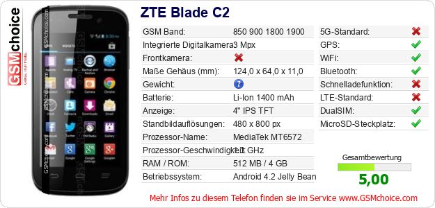 Hast du eigene Webseite? Willst du die Informationen über Standarddaten des Handys ZTE Blade C2 irgendwo veröffentlichen? Das ist sehr einfach. Du kannst das Bild herunterladen oder kopieren und auf der Webseite folgenden Code hinzufügen:Das Einfügen von diesem Code verursacht das Anzeigen von dem folgenden Bild: