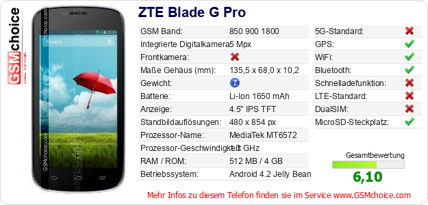 Hast du eigene Webseite? Willst du die Informationen über Standarddaten des Handys ZTE Blade G Pro irgendwo veröffentlichen? Das ist sehr einfach. Du kannst das Bild herunterladen oder kopieren und auf der Webseite folgenden Code hinzufügen:Das Einfügen von diesem Code verursacht das Anzeigen von dem folgenden Bild: