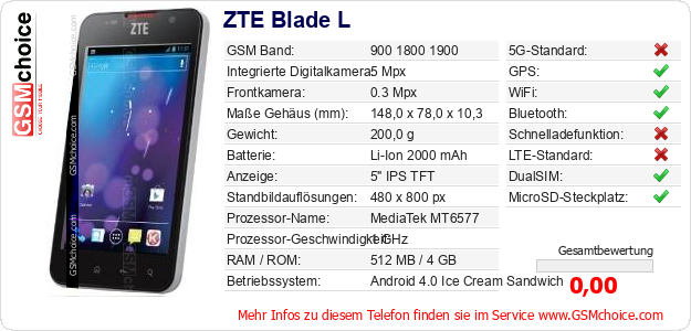 Hast du eigene Webseite? Willst du die Informationen über Standarddaten des Handys ZTE Blade L irgendwo veröffentlichen? Das ist sehr einfach. Du kannst das Bild herunterladen oder kopieren und auf der Webseite folgenden Code hinzufügen:Das Einfügen von diesem Code verursacht das Anzeigen von dem folgenden Bild:
