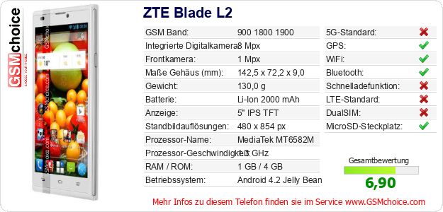 Hast du eigene Webseite? Willst du die Informationen über Standarddaten des Handys ZTE Blade L2 irgendwo veröffentlichen? Das ist sehr einfach. Du kannst das Bild herunterladen oder kopieren und auf der Webseite folgenden Code hinzufügen:Das Einfügen von diesem Code verursacht das Anzeigen von dem folgenden Bild: