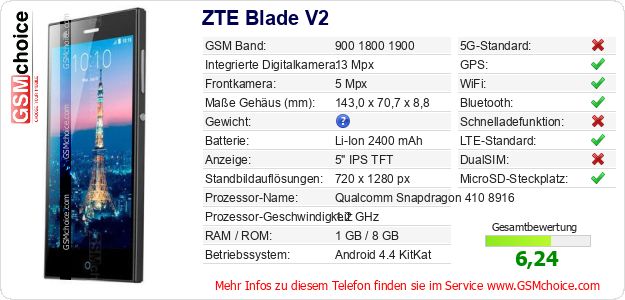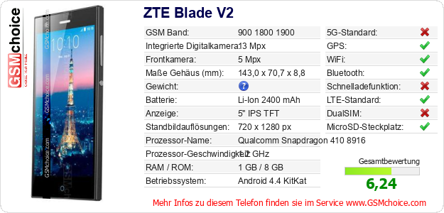 Hast du eigene Webseite? Willst du die Informationen über Standarddaten des Handys ZTE Blade V2 irgendwo veröffentlichen? Das ist sehr einfach. Du kannst das Bild herunterladen oder kopieren und auf der Webseite folgenden Code hinzufügen:Das Einfügen von diesem Code verursacht das Anzeigen von dem folgenden Bild: