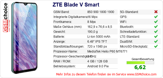 Hast du eigene Webseite? Willst du die Informationen über Standarddaten des Handys ZTE Blade V Smart irgendwo veröffentlichen? Das ist sehr einfach. Du kannst das Bild herunterladen oder kopieren und auf der Webseite folgenden Code hinzufügen:Das Einfügen von diesem Code verursacht das Anzeigen von dem folgenden Bild: