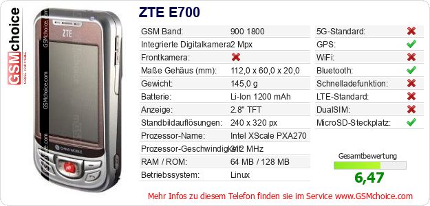 Hast du eigene Webseite? Willst du die Informationen über Standarddaten des Handys ZTE E700 irgendwo veröffentlichen? Das ist sehr einfach. Du kannst das Bild herunterladen oder kopieren und auf der Webseite folgenden Code hinzufügen:Das Einfügen von diesem Code verursacht das Anzeigen von dem folgenden Bild: