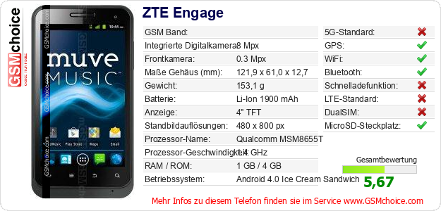 Hast du eigene Webseite? Willst du die Informationen über Standarddaten des Handys ZTE Engage irgendwo veröffentlichen? Das ist sehr einfach. Du kannst das Bild herunterladen oder kopieren und auf der Webseite folgenden Code hinzufügen:Das Einfügen von diesem Code verursacht das Anzeigen von dem folgenden Bild: