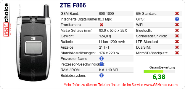 Hast du eigene Webseite? Willst du die Informationen über Standarddaten des Handys ZTE F866 irgendwo veröffentlichen? Das ist sehr einfach. Du kannst das Bild herunterladen oder kopieren und auf der Webseite folgenden Code hinzufügen:Das Einfügen von diesem Code verursacht das Anzeigen von dem folgenden Bild: