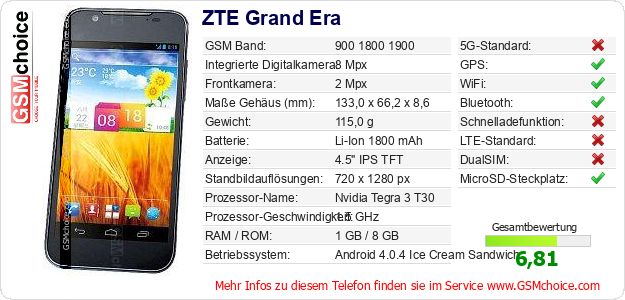 Hast du eigene Webseite? Willst du die Informationen über Standarddaten des Handys ZTE Grand Era irgendwo veröffentlichen? Das ist sehr einfach. Du kannst das Bild herunterladen oder kopieren und auf der Webseite folgenden Code hinzufügen:Das Einfügen von diesem Code verursacht das Anzeigen von dem folgenden Bild: