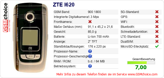 Hast du eigene Webseite? Willst du die Informationen über Standarddaten des Handys ZTE I620 irgendwo veröffentlichen? Das ist sehr einfach. Du kannst das Bild herunterladen oder kopieren und auf der Webseite folgenden Code hinzufügen:Das Einfügen von diesem Code verursacht das Anzeigen von dem folgenden Bild: