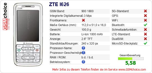 Hast du eigene Webseite? Willst du die Informationen über Standarddaten des Handys ZTE I626 irgendwo veröffentlichen? Das ist sehr einfach. Du kannst das Bild herunterladen oder kopieren und auf der Webseite folgenden Code hinzufügen:Das Einfügen von diesem Code verursacht das Anzeigen von dem folgenden Bild: