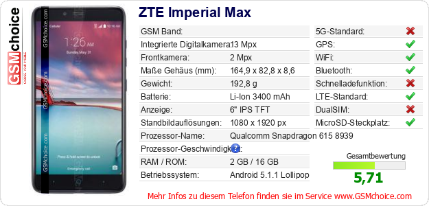 Hast du eigene Webseite? Willst du die Informationen über Standarddaten des Handys ZTE Imperial Max irgendwo veröffentlichen? Das ist sehr einfach. Du kannst das Bild herunterladen oder kopieren und auf der Webseite folgenden Code hinzufügen:Das Einfügen von diesem Code verursacht das Anzeigen von dem folgenden Bild: