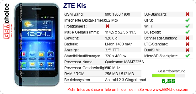 Hast du eigene Webseite? Willst du die Informationen über Standarddaten des Handys ZTE Kis irgendwo veröffentlichen? Das ist sehr einfach. Du kannst das Bild herunterladen oder kopieren und auf der Webseite folgenden Code hinzufügen:Das Einfügen von diesem Code verursacht das Anzeigen von dem folgenden Bild: