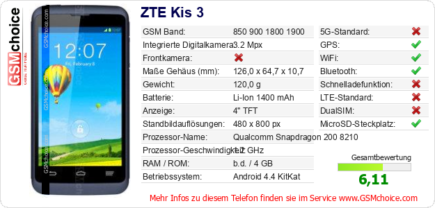 Hast du eigene Webseite? Willst du die Informationen über Standarddaten des Handys ZTE Kis 3 irgendwo veröffentlichen? Das ist sehr einfach. Du kannst das Bild herunterladen oder kopieren und auf der Webseite folgenden Code hinzufügen:Das Einfügen von diesem Code verursacht das Anzeigen von dem folgenden Bild: