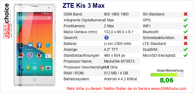 Hast du eigene Webseite? Willst du die Informationen über Standarddaten des Handys ZTE Kis 3 Max irgendwo veröffentlichen? Das ist sehr einfach. Du kannst das Bild herunterladen oder kopieren und auf der Webseite folgenden Code hinzufügen:Das Einfügen von diesem Code verursacht das Anzeigen von dem folgenden Bild: