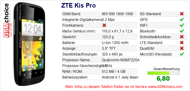 Hast du eigene Webseite? Willst du die Informationen über Standarddaten des Handys ZTE Kis Pro irgendwo veröffentlichen? Das ist sehr einfach. Du kannst das Bild herunterladen oder kopieren und auf der Webseite folgenden Code hinzufügen:Das Einfügen von diesem Code verursacht das Anzeigen von dem folgenden Bild: