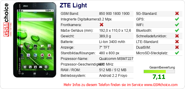 Hast du eigene Webseite? Willst du die Informationen über Standarddaten des Handys ZTE Light irgendwo veröffentlichen? Das ist sehr einfach. Du kannst das Bild herunterladen oder kopieren und auf der Webseite folgenden Code hinzufügen:Das Einfügen von diesem Code verursacht das Anzeigen von dem folgenden Bild: