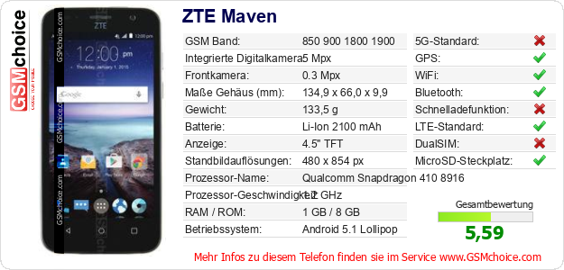 Hast du eigene Webseite? Willst du die Informationen über Standarddaten des Handys ZTE Maven irgendwo veröffentlichen? Das ist sehr einfach. Du kannst das Bild herunterladen oder kopieren und auf der Webseite folgenden Code hinzufügen:Das Einfügen von diesem Code verursacht das Anzeigen von dem folgenden Bild: