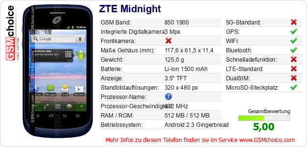 Hast du eigene Webseite? Willst du die Informationen über Standarddaten des Handys ZTE Midnight irgendwo veröffentlichen? Das ist sehr einfach. Du kannst das Bild herunterladen oder kopieren und auf der Webseite folgenden Code hinzufügen:Das Einfügen von diesem Code verursacht das Anzeigen von dem folgenden Bild: