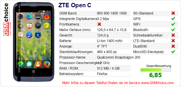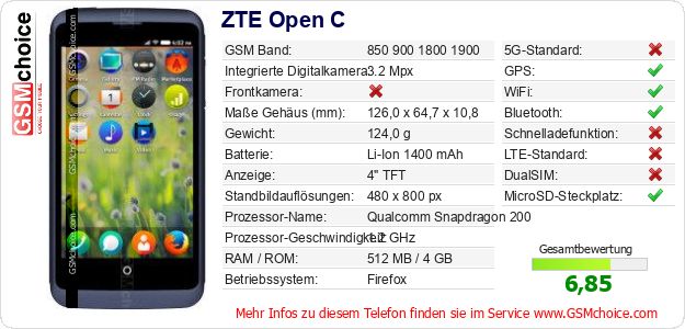 Hast du eigene Webseite? Willst du die Informationen über Standarddaten des Handys ZTE Open C irgendwo veröffentlichen? Das ist sehr einfach. Du kannst das Bild herunterladen oder kopieren und auf der Webseite folgenden Code hinzufügen:Das Einfügen von diesem Code verursacht das Anzeigen von dem folgenden Bild: