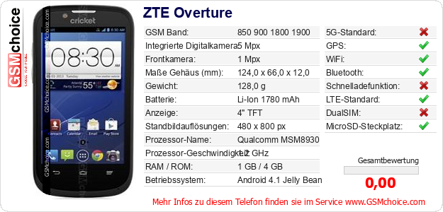 Hast du eigene Webseite? Willst du die Informationen über Standarddaten des Handys ZTE Overture irgendwo veröffentlichen? Das ist sehr einfach. Du kannst das Bild herunterladen oder kopieren und auf der Webseite folgenden Code hinzufügen:Das Einfügen von diesem Code verursacht das Anzeigen von dem folgenden Bild: