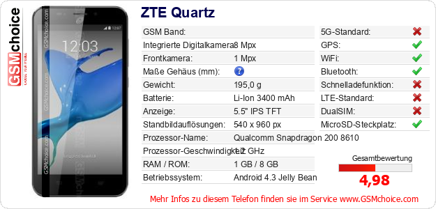 Hast du eigene Webseite? Willst du die Informationen über Standarddaten des Handys ZTE Quartz irgendwo veröffentlichen? Das ist sehr einfach. Du kannst das Bild herunterladen oder kopieren und auf der Webseite folgenden Code hinzufügen:Das Einfügen von diesem Code verursacht das Anzeigen von dem folgenden Bild:
