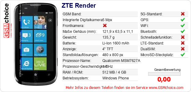 Hast du eigene Webseite? Willst du die Informationen über Standarddaten des Handys ZTE Render irgendwo veröffentlichen? Das ist sehr einfach. Du kannst das Bild herunterladen oder kopieren und auf der Webseite folgenden Code hinzufügen:Das Einfügen von diesem Code verursacht das Anzeigen von dem folgenden Bild: