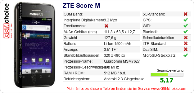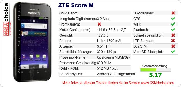 Hast du eigene Webseite? Willst du die Informationen über Standarddaten des Handys ZTE Score M irgendwo veröffentlichen? Das ist sehr einfach. Du kannst das Bild herunterladen oder kopieren und auf der Webseite folgenden Code hinzufügen:Das Einfügen von diesem Code verursacht das Anzeigen von dem folgenden Bild: