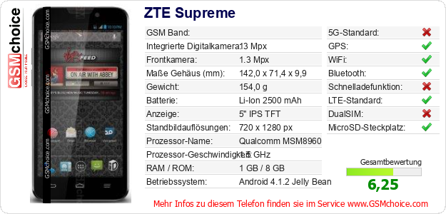 Hast du eigene Webseite? Willst du die Informationen über Standarddaten des Handys ZTE Supreme irgendwo veröffentlichen? Das ist sehr einfach. Du kannst das Bild herunterladen oder kopieren und auf der Webseite folgenden Code hinzufügen:Das Einfügen von diesem Code verursacht das Anzeigen von dem folgenden Bild: