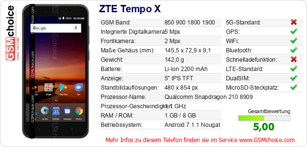 Hast du eigene Webseite? Willst du die Informationen über Standarddaten des Handys ZTE Tempo X irgendwo veröffentlichen? Das ist sehr einfach. Du kannst das Bild herunterladen oder kopieren und auf der Webseite folgenden Code hinzufügen:Das Einfügen von diesem Code verursacht das Anzeigen von dem folgenden Bild: