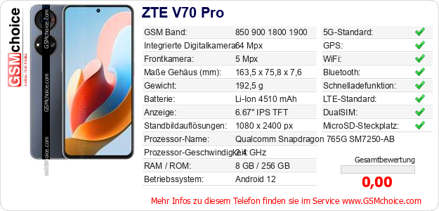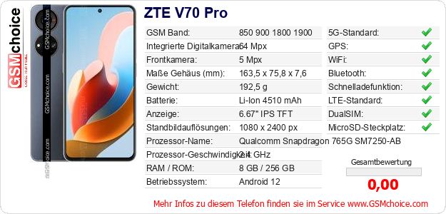 Hast du eigene Webseite? Willst du die Informationen über Standarddaten des Handys ZTE V70 Pro irgendwo veröffentlichen? Das ist sehr einfach. Du kannst das Bild herunterladen oder kopieren und auf der Webseite folgenden Code hinzufügen:Das Einfügen von diesem Code verursacht das Anzeigen von dem folgenden Bild: