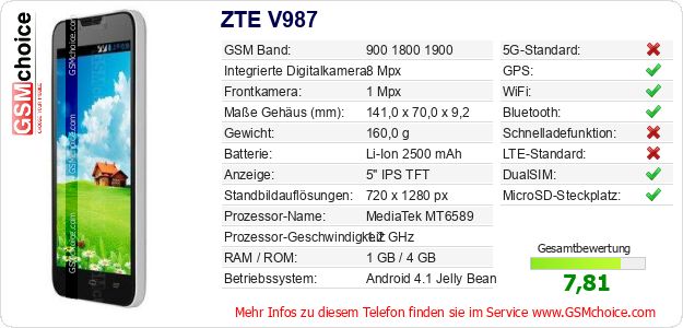 Hast du eigene Webseite? Willst du die Informationen über Standarddaten des Handys ZTE V987 irgendwo veröffentlichen? Das ist sehr einfach. Du kannst das Bild herunterladen oder kopieren und auf der Webseite folgenden Code hinzufügen:Das Einfügen von diesem Code verursacht das Anzeigen von dem folgenden Bild: