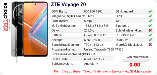 Hast du eigene Webseite? Willst du die Informationen über Standarddaten des Handys ZTE Voyage 70 irgendwo veröffentlichen? Das ist sehr einfach. Du kannst das Bild herunterladen oder kopieren und auf der Webseite folgenden Code hinzufügen:Das Einfügen von diesem Code verursacht das Anzeigen von dem folgenden Bild: