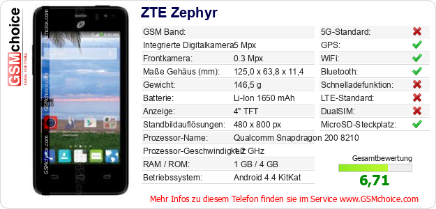 Hast du eigene Webseite? Willst du die Informationen über Standarddaten des Handys ZTE Zephyr irgendwo veröffentlichen? Das ist sehr einfach. Du kannst das Bild herunterladen oder kopieren und auf der Webseite folgenden Code hinzufügen:Das Einfügen von diesem Code verursacht das Anzeigen von dem folgenden Bild: