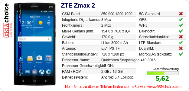 Hast du eigene Webseite? Willst du die Informationen über Standarddaten des Handys ZTE Zmax 2 irgendwo veröffentlichen? Das ist sehr einfach. Du kannst das Bild herunterladen oder kopieren und auf der Webseite folgenden Code hinzufügen:Das Einfügen von diesem Code verursacht das Anzeigen von dem folgenden Bild: