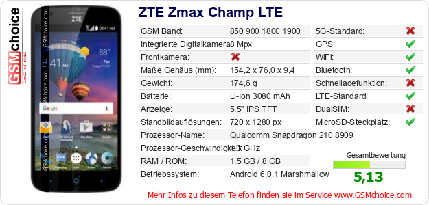 Hast du eigene Webseite? Willst du die Informationen über Standarddaten des Handys ZTE Zmax Champ LTE irgendwo veröffentlichen? Das ist sehr einfach. Du kannst das Bild herunterladen oder kopieren und auf der Webseite folgenden Code hinzufügen:Das Einfügen von diesem Code verursacht das Anzeigen von dem folgenden Bild: