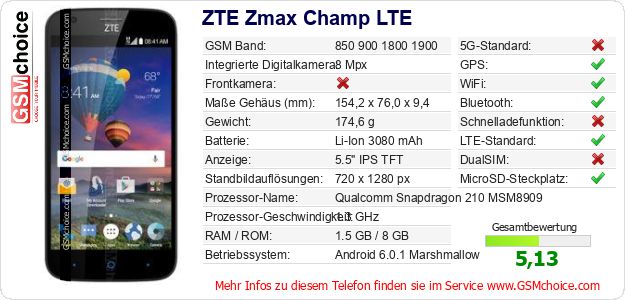 Daten des Mobiltelefons ZTE Zmax Champ LTE auf Ihrer Seite