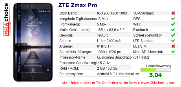 Hast du eigene Webseite? Willst du die Informationen über Standarddaten des Handys ZTE Zmax Pro irgendwo veröffentlichen? Das ist sehr einfach. Du kannst das Bild herunterladen oder kopieren und auf der Webseite folgenden Code hinzufügen:Das Einfügen von diesem Code verursacht das Anzeigen von dem folgenden Bild: